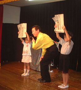 | 「今日のマジックでね。火が燃えてね。ハンカチがいっぱい出て、パラパラパラ・・って」 このマジックが一番すごかったと何人も言っていました。 もちろん、赤いボールも、うさぎも、ビンとコップもと、、次々に出てきました。 |