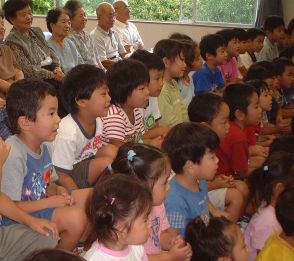 | 14年9月6日 保育園に地域のお年寄りを招待して、地域交流事業「敬老の集い」をしました。 おじいちゃんのお話を聞いて、子供たちも歌を歌って・・・ |