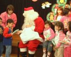 | プレゼントの後はサンタさんと一緒に写真撮影。 おおきくて、ちょっぴりこわいと泣く小さい子・・・ 平気で抱っこする子。近くで一緒に写りたい子・・・・・・・ |
