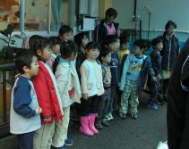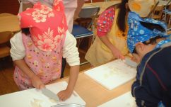 | ぞう組ときりん組が、お昼に食べるけんちん汁の人参や大根を切りました。 初めて包丁を持つきりん組は緊張!!でも、上手にできました。 園庭では2階からシートを張った下で、お餅つきが始まりました。 かまどは使用できなかったので、調理室で蒸かしました。 雨の寒い中地域のお年寄りや保護者会の役員さん 保育園の理事さんたちがお餅つきをはじめました。 |