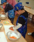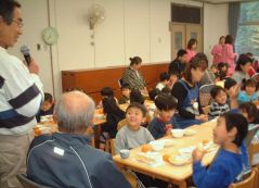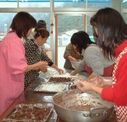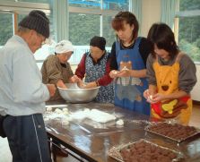 | 搗きあがると、今度はおばあちゃんたちが保護者会の役員のお母さんたちに 大福もちの作り方を教えてくれます。 おばあちゃんが作った大福は、真っ白でふんわり。 お母さんが作った大福は色黒(上が薄くなってしまって中のあんこが・・・) なかなか難しいけど、楽しかったとお母さんたち |