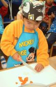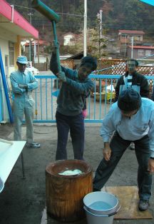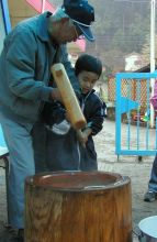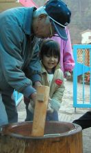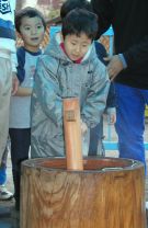 | 子供たちも、一人ずつ搗きました。ぞう組は一人で・・・ちいさい組はおじいちゃんに手伝ってもらって |