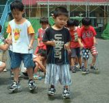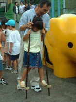 | 竹ぽっくりです、おじいちゃんが作ってくれました。竹馬は難しい・・・理事長先生に持ってもらって。 でも、楽しかったなぁ。みんなの目がキラキラしている一日でした。 |