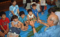 | 笹舟作りに挑戦 最初は笹の葉で作りましたが、やっぱり上手にできないので、 カヤを使うことになりました。ボランティアできていた中学生もはじめてみたい。一緒に作ってみました。 おじいちゃんにすっかり抱っこは誰かな・・・・ |