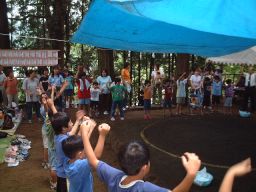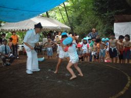 | 子供たちは夏体験ボランティアで来てくれた中学生のお兄ちゃんに相撲のとり方を教えてもらい、 練習してきました。お兄ちゃんは相撲大会でいつも優勝するすごいおにいちゃんです |