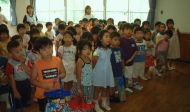 | 川に行ってから、園長先生のお話を聞きました。 さぁ、みんなで楽しく遊びましょう。 |
