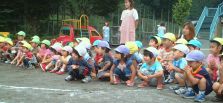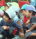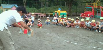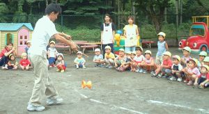 | 保育園で朝から夕方まで、一日中遊んでくれました。 運動会の練習の間に、ジャグリングを見せてくだました。 みんな、ビックリ。「すっご〜い!!」 ビックリしすぎて拍手を忘れてしまいました。 すごい!マジックみたい〜って、言っていました。園長先生のマジックの見すぎかな? |