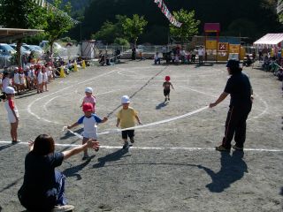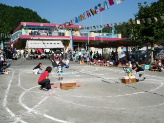 かけっこです。 みんな、頑張れ。がんばれ!! 小さい組はゴールテープの前で止まってしまって それがかわいいですね。 |