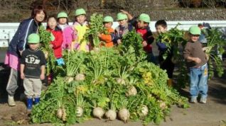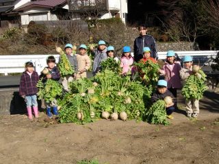 | 2004.12.24 8月末に畑に大根の種をまきました。 聖護院大根です。 大きなカブのようにぬいてみたい。。。。 子供の願いがかないました。 |