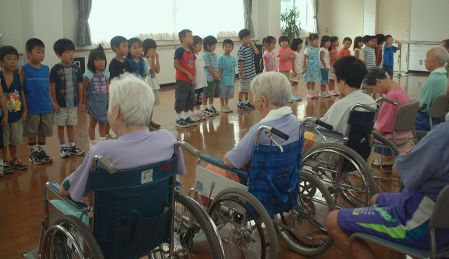| 飯能リハビリ館 ディサービスなので人数も少なく、3箇所目、子供たちもちょっとリラックス。 自分たちで作った、手染めののれん、自慢げにプレゼントしています。 褒めてもらってうれしそう・・・ |