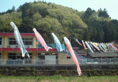 | 今年は保育園の対岸からJA成木支店さんの屋上までこいのぼりを渡しました。 | |