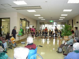 | ぞう組が玉すだれで老人ホームを訪問しました。 みんな上手でした。挑戦した職員さん、なかなかできなくて子供たちが教えていました。2005.1.6 |