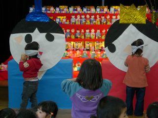 | お雛様の福笑いをみんなで楽しみました・どうして、そんなとこに鼻があるのぉ・・・ |