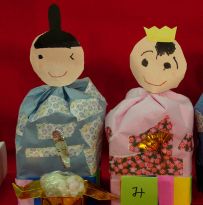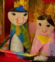 牛乳パックに折り紙と千代紙を貼って、ひな人形を作りました。 台はティシュペーパーの箱でできています。 |