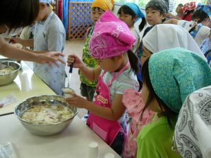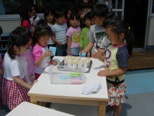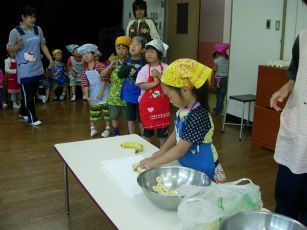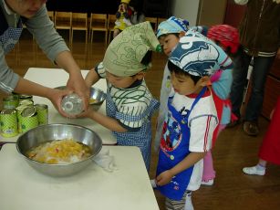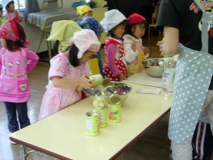 5月生まれの誕生会で調理保育フルーツポンチを作りました。