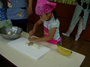| バナナを包丁で切って、果物の缶詰を混ぜて |