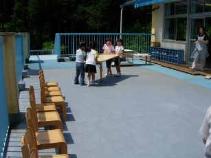 カップに盛り付けました。 2階のベランダに会場を準備します。