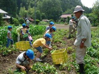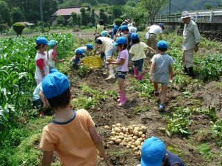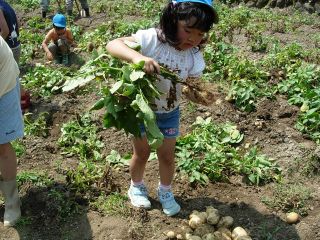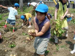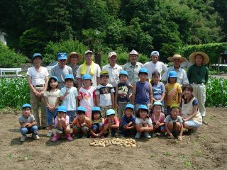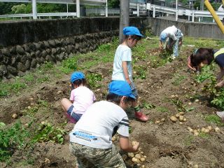 19年6月20日、5歳児ぞう組が自分で植えたじゃが芋を掘りに行きました おじいちゃんは畑に先に行って 待っていてくれました。 |