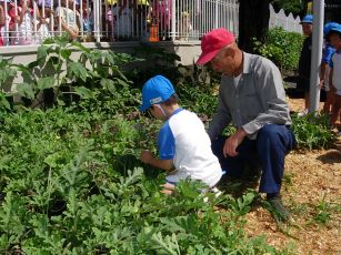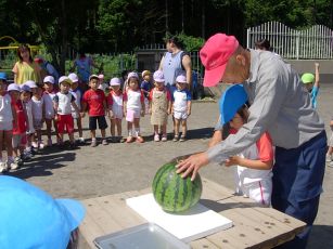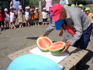 代表が、スイカを育ててくれた用務員さんとツルを切りました。