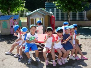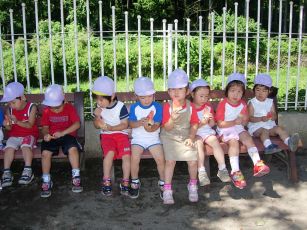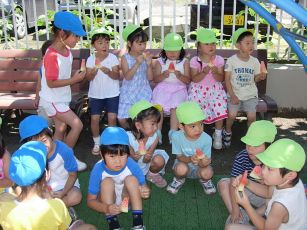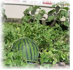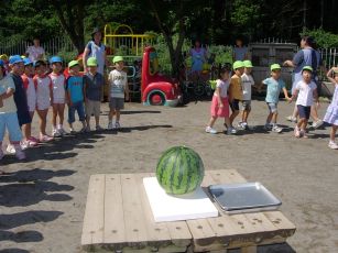 保育園のフェンス沿いに植えたスイカが大きくなりました。