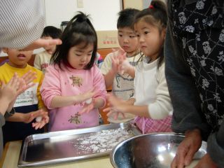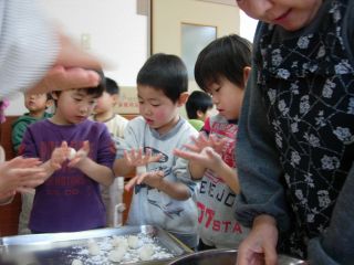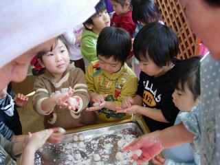 子どもたちが、手でころころと小さい団子にします。