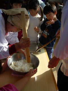 やがて蒸しあがって、熱々を麺棒で搗きました。
