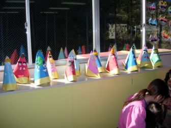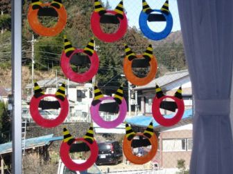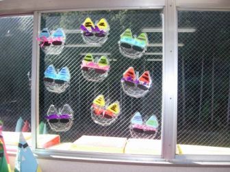 子どもたちが作ったお面が、ホールの窓につけられました。