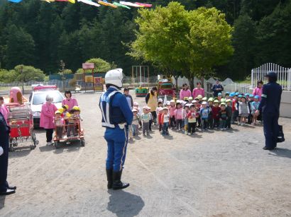 保育園に戻ってきて、かっこいい白バイに乗せていただきました。みんな、すっごくうれしそうでした。 |