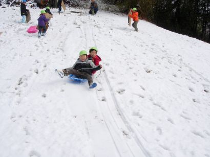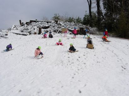 ぞう組ときりん組の子どもたちは、成木6丁目にそりあそびに出かけました。