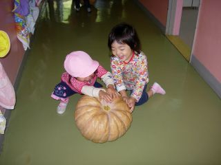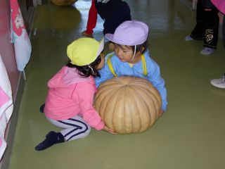 | 地区のおじさんから、大きな南瓜を5個もいただきました。 どうしようか。。どこにおこうか・・いたずら心の職員。 子供たちがどんなことするか、廊下にてんてんと おいてみようよ。登園前に、廊下に置かれた南瓜。 |