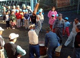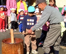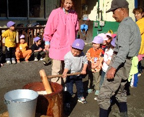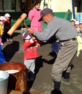 2歳以上は全員が杵を持って、体験します。自分でついたお餅はおいしいです。