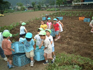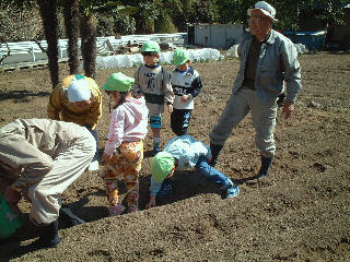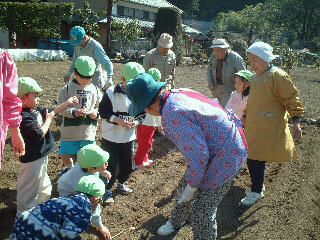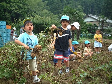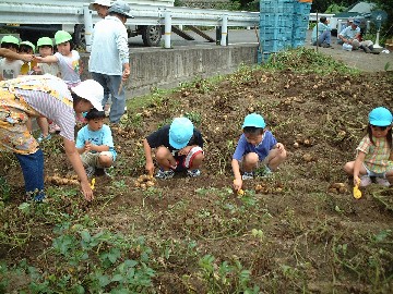 | 13年6月27日、5歳児ぞう組が自分で植えたじゃが芋を掘りに行きました きりん組も一緒に。そして、おじいちゃんやおばあちゃんは畑に先に行って 待っていてくれました。 |