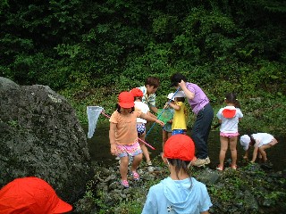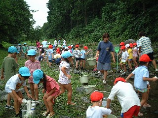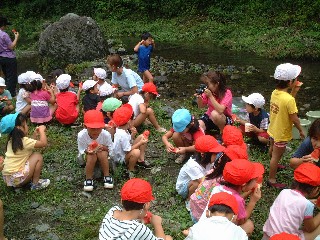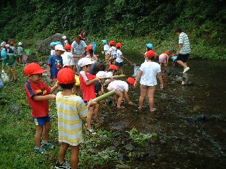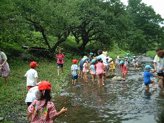 とても、涼しい日。成木保育園のすぐ下の川に、千ヶ瀬第1保育園の子供たちを招待。