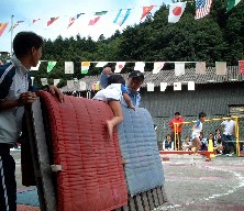 体操の先生と用務員の先生で、板を必死でおさえます。