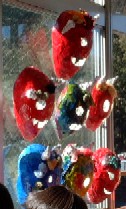 ホールの窓に自分たちで作った鬼のお面を貼って、豆をまきます。