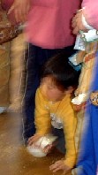 先生の足の後ろから様子をうかがいます。