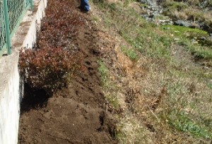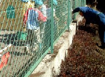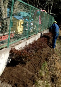 フェンスの外では用務員さんが子ども達が運んだ土を