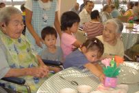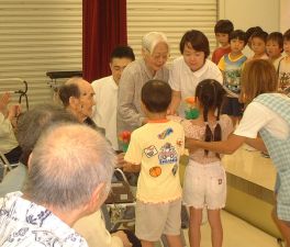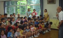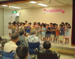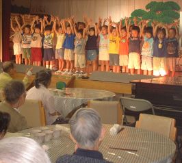 | 14年9月6日 保育園に地域のお年寄りを招待して、地域交流事業「敬老の集い」をしました。 おじいちゃんのお話を聞いて、子供たちも歌を歌って・・・ |