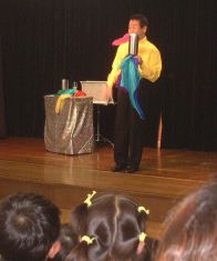 | 「今日のマジックでね。火が燃えてね。ハンカチがいっぱい出て、パラパラパラ・・って」 このマジックが一番すごかったと何人も言っていました。 もちろん、赤いボールも、うさぎも、ビンとコップもと、、次々に出てきました。 |