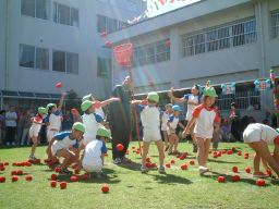 | 組体操を見ていただきました。たくさん拍手をいただきました。 芝部でとっても気持ちが良かったです。 体操教室の日だったので、体操の先生と一緒にしました。 |
