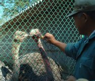 | それから、手をつないで、ダチョウのいる山田さんの家まで歩きました。 大きい〜!! 子供たちが行くとダチョウが近寄ってきます。 |
