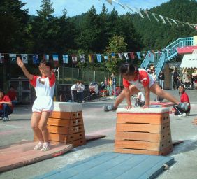 | きりん組4歳児のサーキット マットで前転 平均台 そして跳び箱を横に跳んで。。。 |