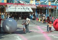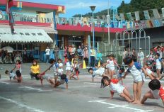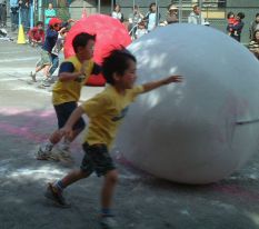 | 最初は小学生、続いておじいちゃんや おばあちゃん、来賓の方々の 紅白大玉ころがし。 とっても大きいので 迫力満点!! |