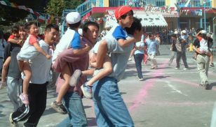 きりん ぞう組親子の突撃!!おんぶ騎馬戦 お父さんやお母さんの背中に乗って帽子の 取り合いです。 すごい迫力。今年はほとんどお父さんの出場。 砂煙になってしまいました。 子供たちもおんぶしてもらってうれしそう |