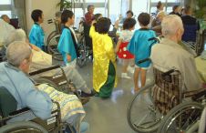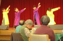 | 飯能リハビリ館 12月9日 成木台病院を後に、保育園のバスに乗って、埼玉県に入りました。 この施設でもお遊戯での訪問は初めてです。 ディサービスなので、見てくださる方は少なかったのですが、保育園の地元の方もいらっしゃいます。 皆さんとってもお元気で、いろいろな言葉もかけてくださいました。 |
