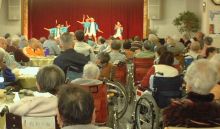| あゆみえん 12月8日 最初の訪問はあゆみえんです。大勢のおじいちゃんやおばあちゃんが続々とホールに集まってきます。 歓迎の文字やめくりの準備までしてくださっていました。 4箇所の施設訪問で最初だったので、ちょっと緊張でした。昇降舞台を一番高くして見ていただきました。 |