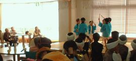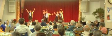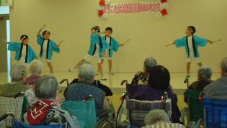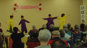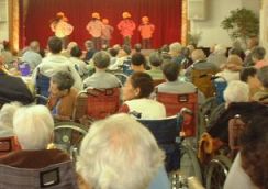 | 九十九園 12月8日 あゆみえんのあとは、バスに乗って、30年近く前から訪問している九十九園に行きました。 11時15分から1時間、大きな舞台で、頑張りました。 終ったお友達はおじいちゃんたちの車椅子のところで踊りだしました。 |