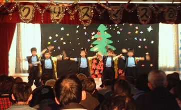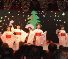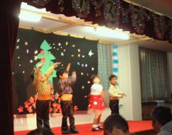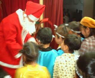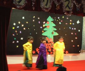 | 成木台病院 12月9日 すっかりクリスマスムードで、舞台も職員の方々の手作り、サンタさん、トナカイさん、お猿さんに天使さんたち そして、大勢の人たちの熱気いっぱいの会場に子供たちもビックリでした。お遊戯で訪問することは初めてでしたので みなさんビックリ大喜びしてくださいました。サンタさんからプレゼントを頂いてしまいました。 |