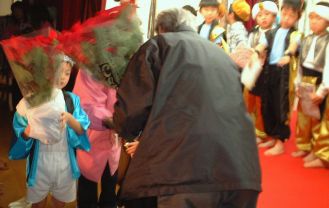 | 子供たちもすっかりリラックス・・・ お友達の遊戯を一緒に踊りだして、年長組のお姉さんから4歳児が言われていました。 「ねぇ、静かにしないといけないんだよ、暴れていると汚れちゃうよ、それ衣装なんだよ」 「危ないでしょう〜、おじいちゃんたちにぶつかったら危ないよ」 そう言うお姉さんたちも最後はよさこいソーランロックを袂を振って踊っていました。 |