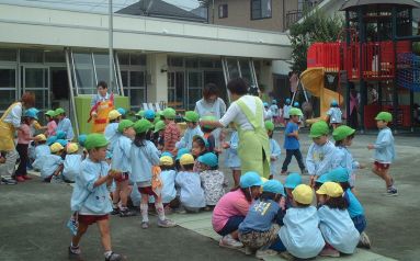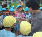 | 保育園のバスに乗って、チヶ瀬第一保育園に行きました。園庭でみんな揃ってお話を聞きました。 |